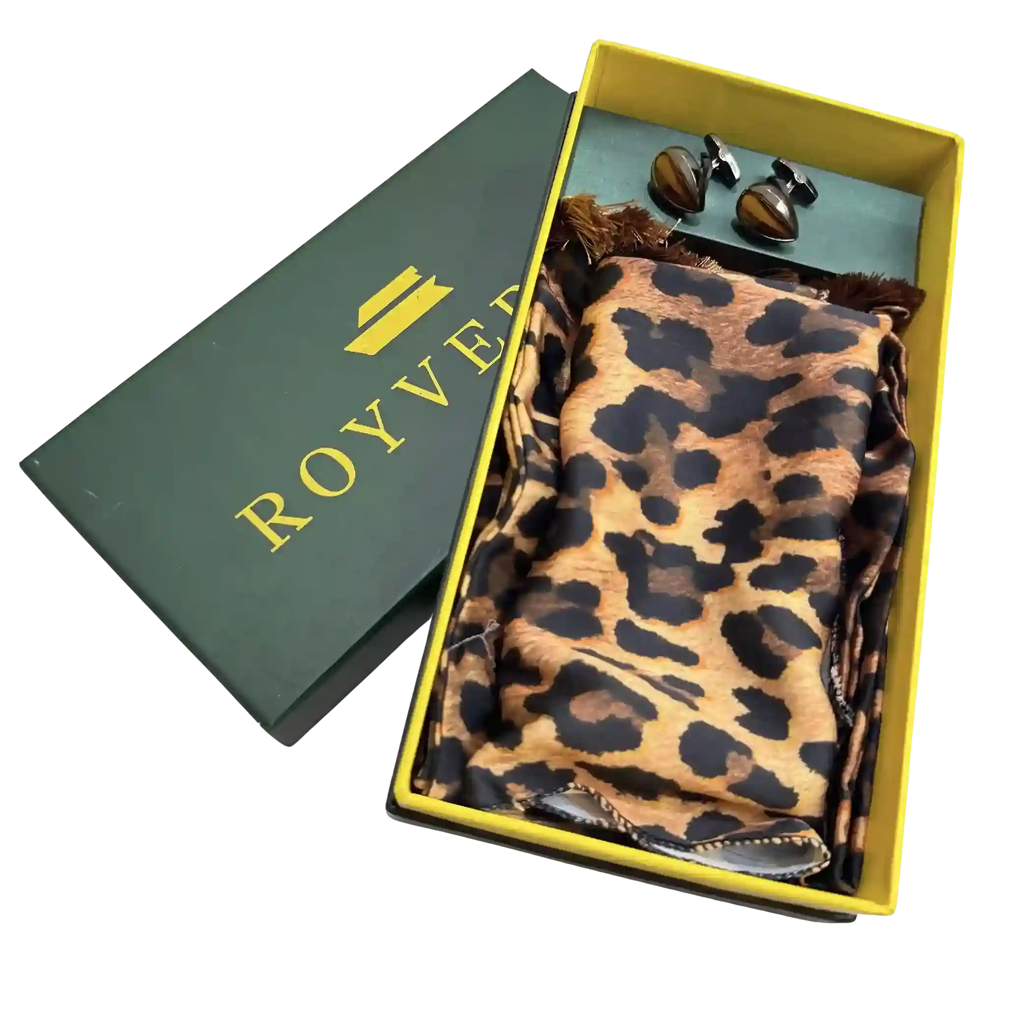 Channel the intense gaze of the wild. This exclusive Leopard Scarf Set features a premium silk scarf, matching pocket square, and striking leopard eye cufflinks in gold and black. For the man who owns his power with every detail.
