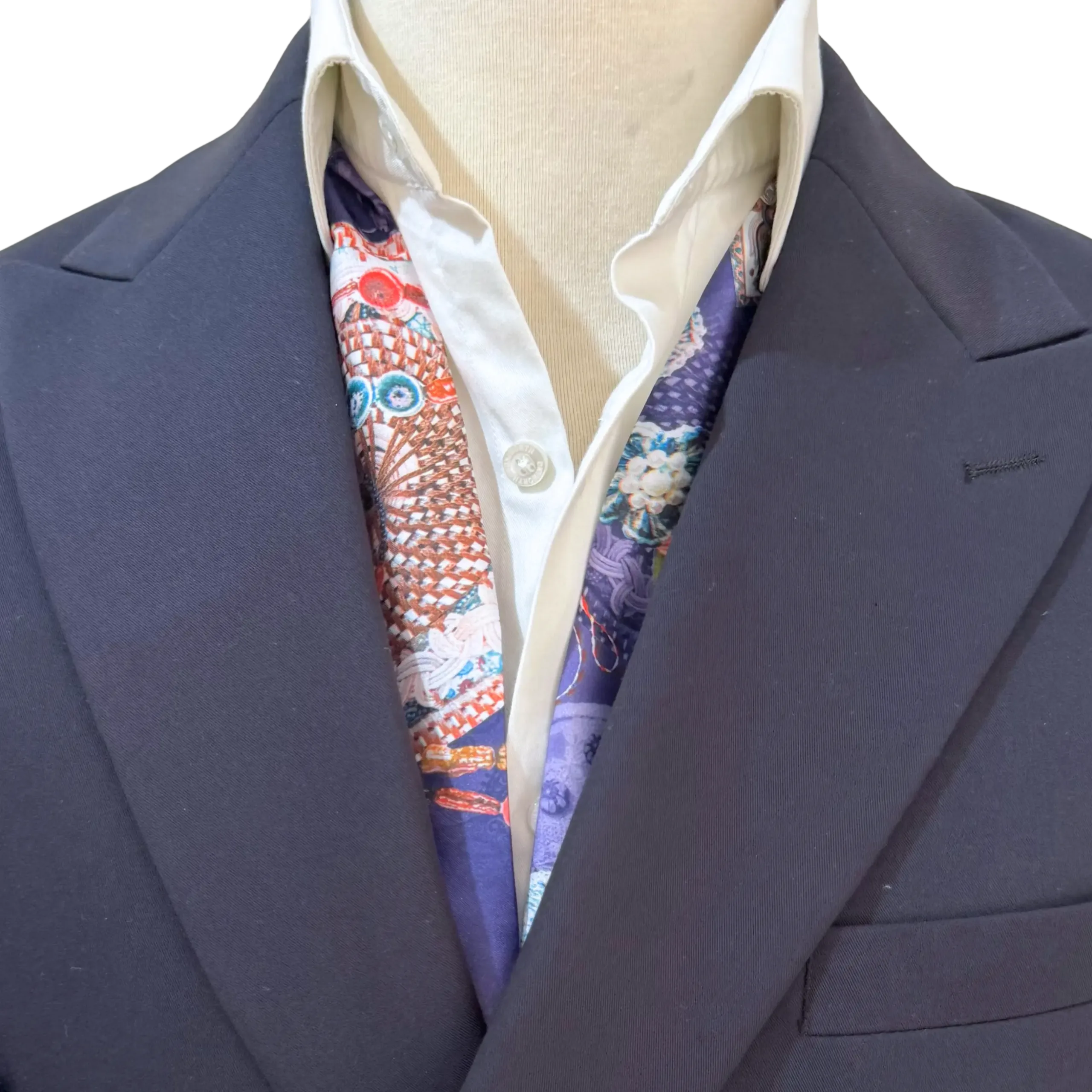 Royverra Purple Fiorito Ascot Tie. This beautiful ascot tie is made from soft, high-quality silk and adds a touch of luxury. Perfect for special events like weddings, parties, or formal gatherings, this ascot tie is designed for men who appreciate elegance and comfort. The floral design is inspired by classic Italian style, giving you a sophisticated look that stands out.