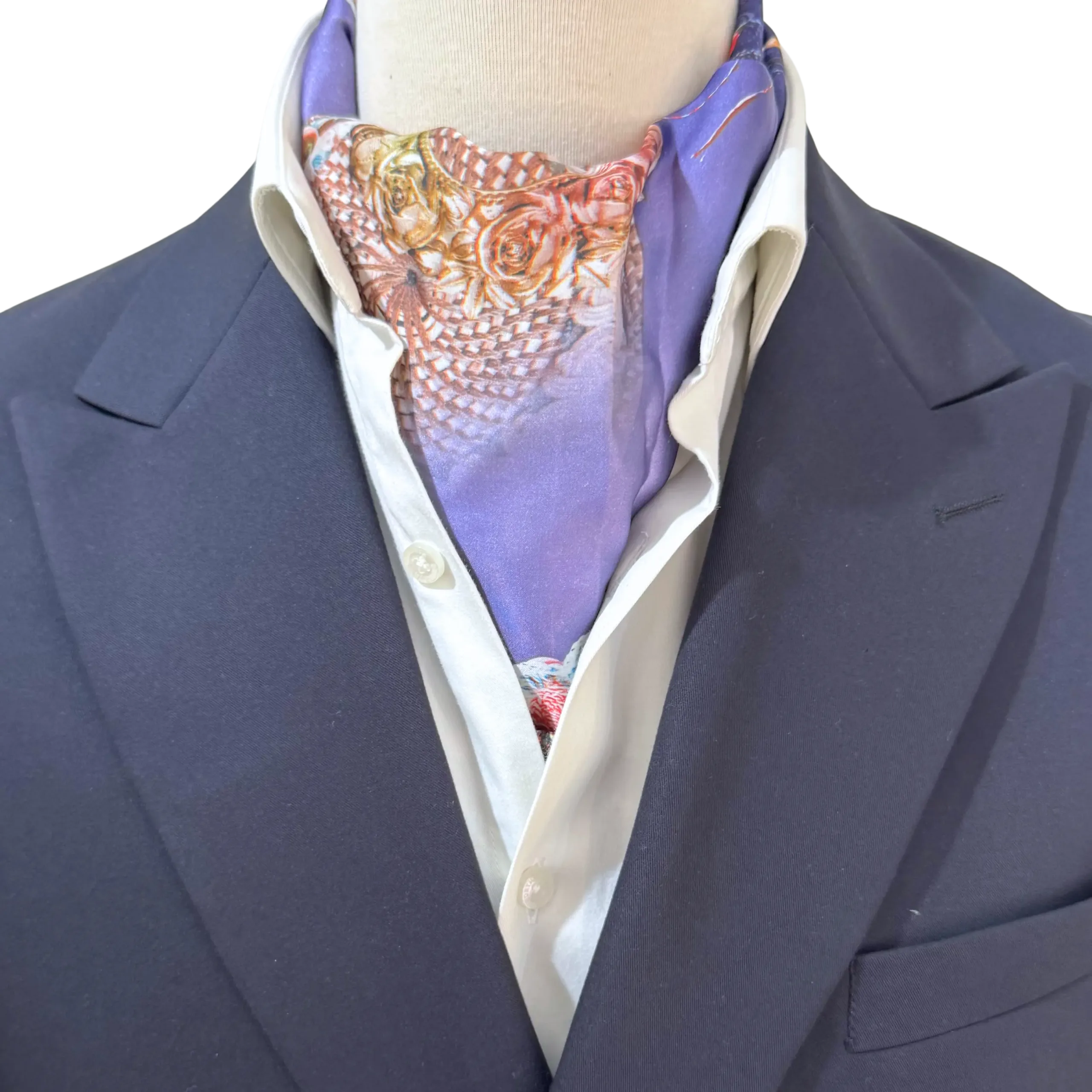 Royverra Purple Fiorito Ascot Tie. This luxurious silk tie features an all-over print of intricate purple flowers. A Italian-inspired design for the discerning gentleman.