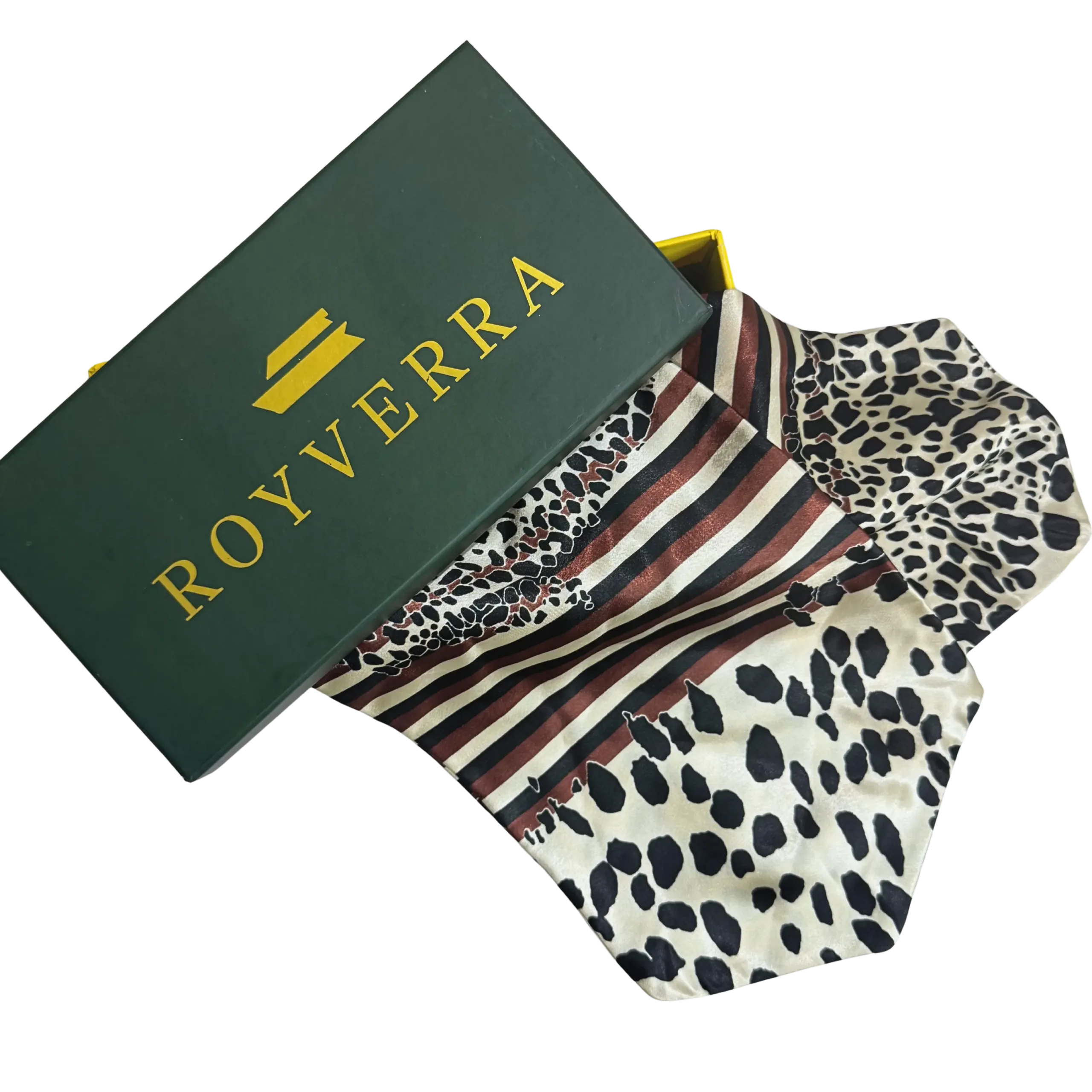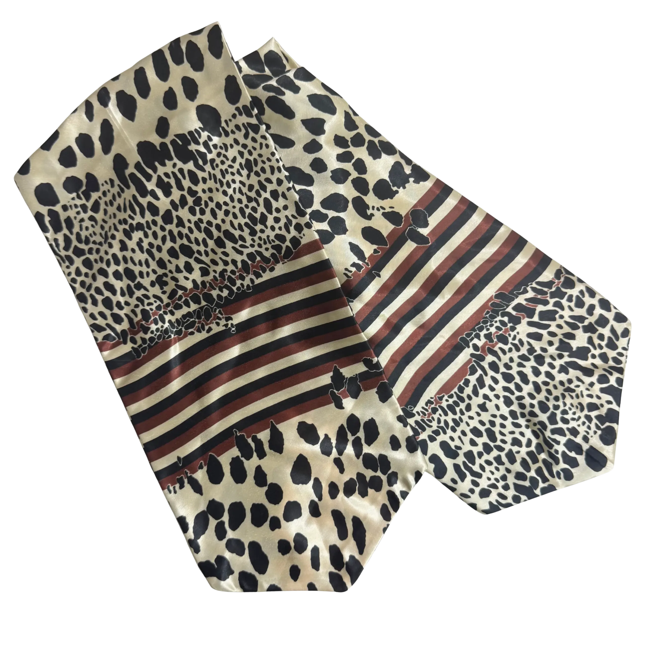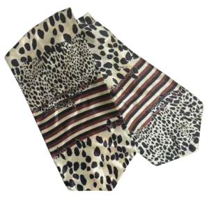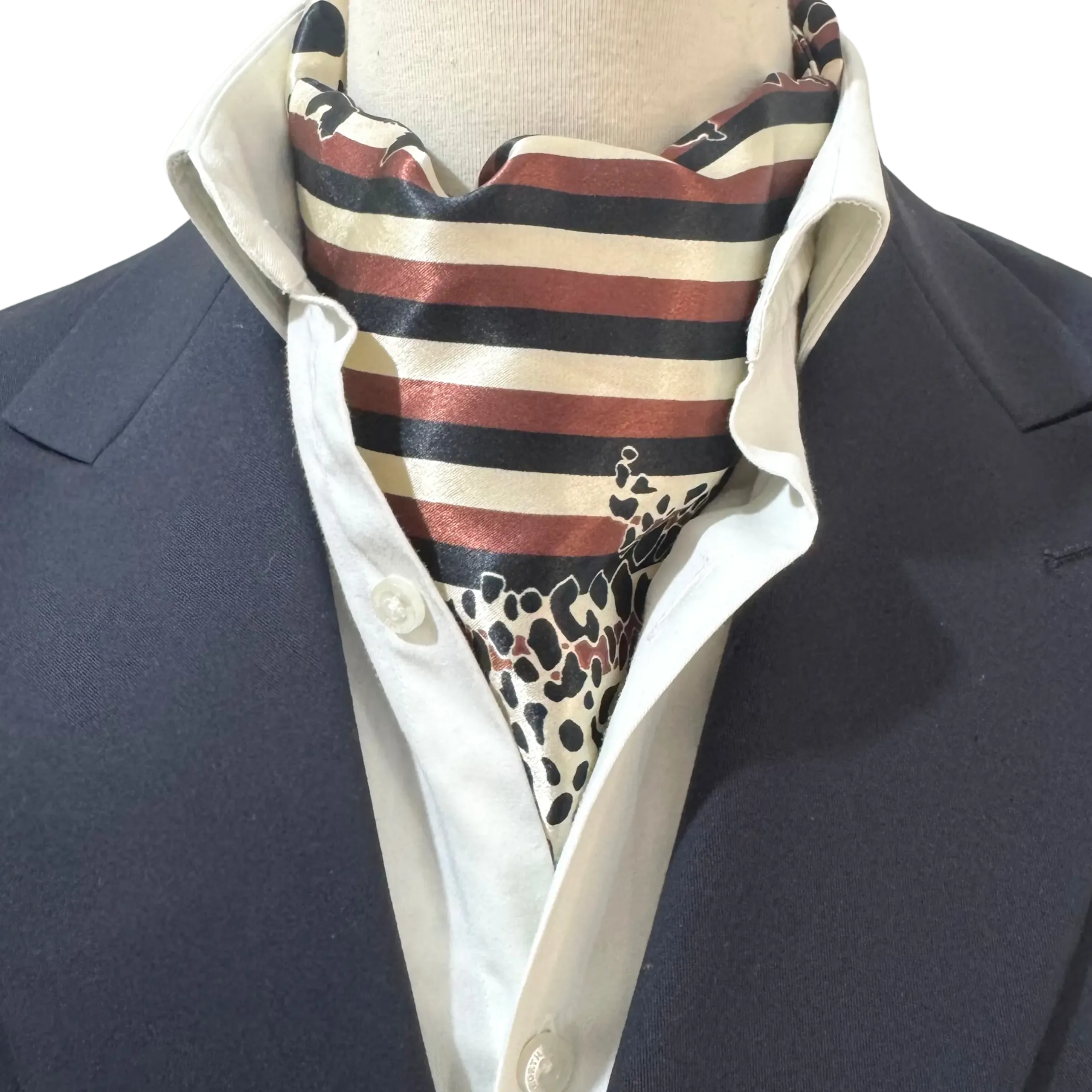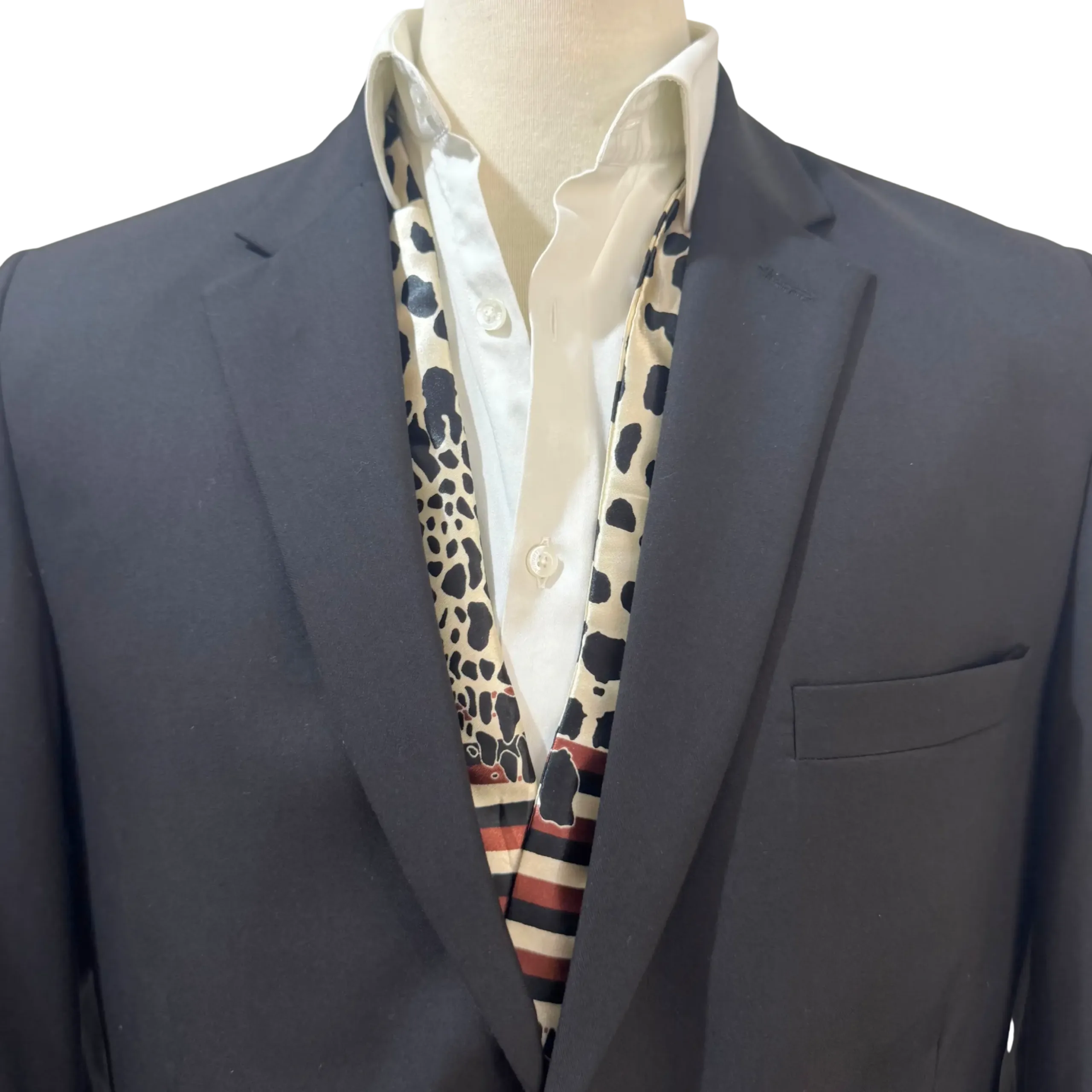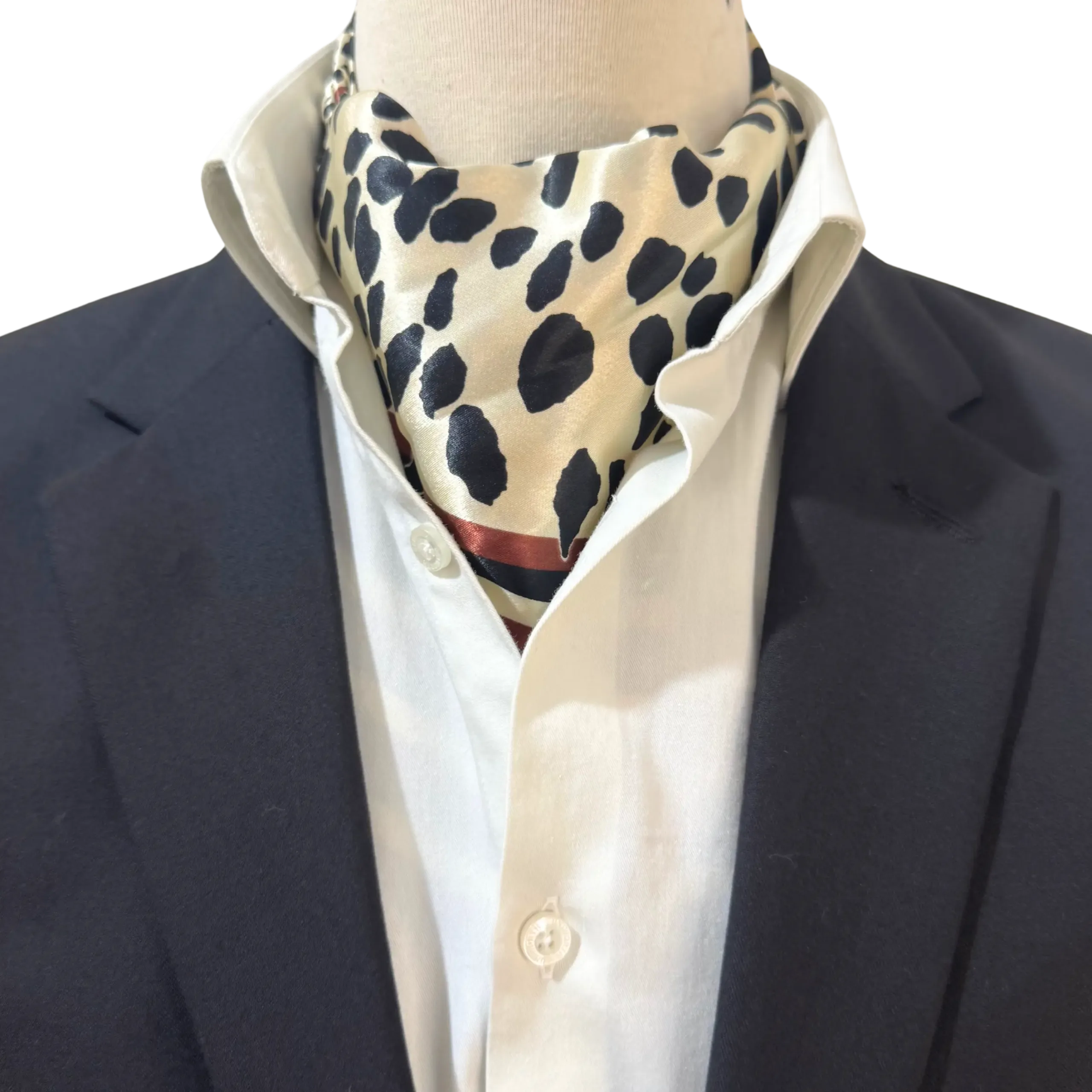 Royverra Safari Ascot tie crafted from incredibly soft silk in a milky white base, this statement piece features an all-over print of abstract black cheetah-like dots, accented by a unique section of black and brown linear stripes for added depth and texture.