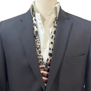 Royverra Safari Ascot is a confident & head-turning piece for the modern gentleman who isn’t afraid to make a statement. Made from luxuriously soft silk in a rich milky white color. The design is elevated by a striking section of black and brown linear stripes, creating a unique texture and visual interest that sets it apart from anything else.