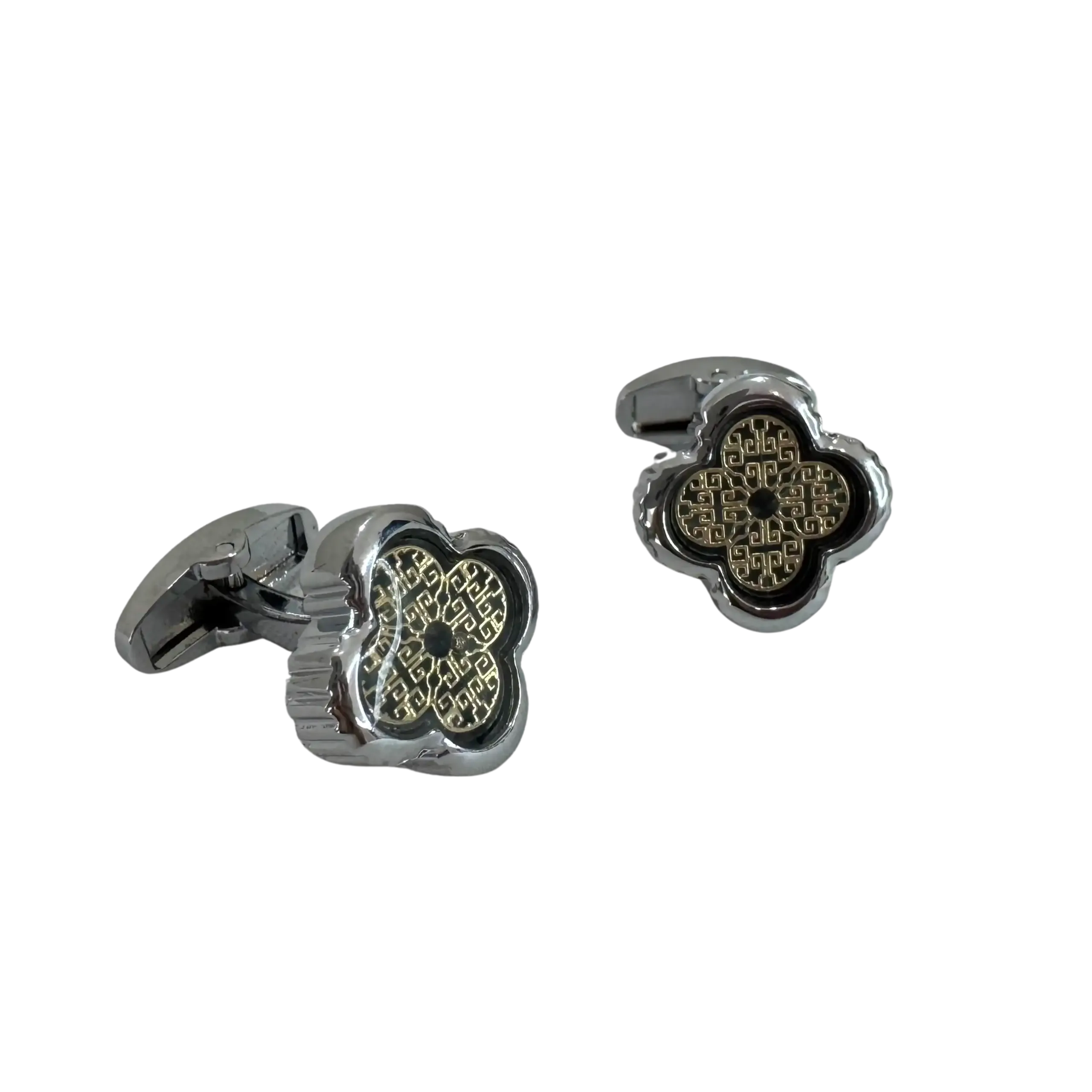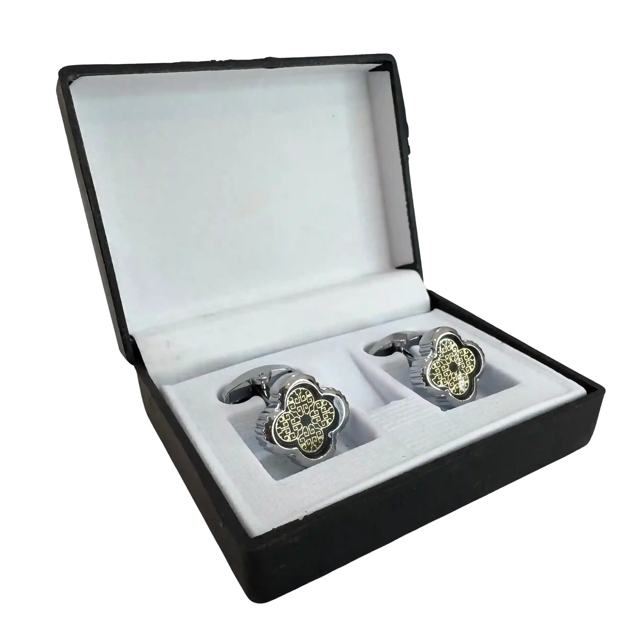 Enhance your formal attire with these elegant Silver Flower men’s cufflinks, featuring a polished silver base and a distinctive flower-shaped top. The four-sided black background beautifully contrasts the intricate golden floral design, creating a sophisticated and eye-catching accessory. Perfect for weddings, business meetings, and special occasions, these cufflinks combine classic craftsmanship with refined style.